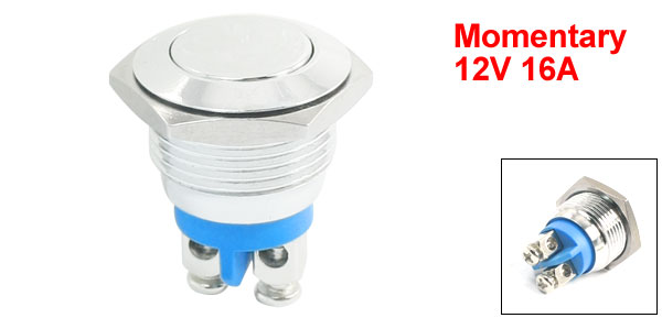 Item Name Push Button Switch Action Type Momentary Type Head Shape Flat Head Contact SPST(ON/OFF ) Switch Rating 12V 16A Terminals Number 2 Thread Diameter 16mm/0.63" Total Size 24 x 19mm/0.94" x 0.75" (L*Max.W) Material Metal, Plastic, Electric Parts Housing Color Silver Tone Weight 16g Package Content 1 x Push Button Switch - Reviews