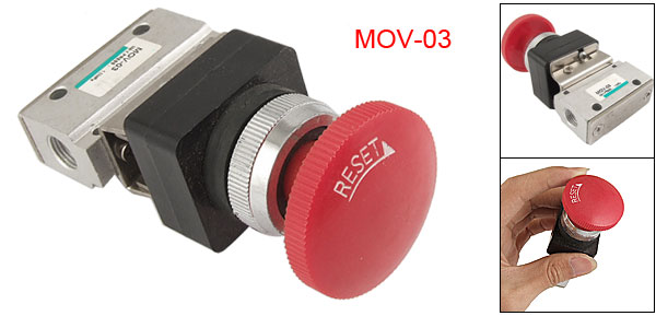 Product Name Mechanical Valve Model MOV-03 Button Type Emergency Mushroom Push Button w Lock Control Type Manual Control Medium 40 Micron Filtered Air Position and Way No. 2 / 3 Fit Pipe Size RC 1/8 Port Size 8.2mm/0.32" Install Hole Diameter 4.3mm/0.17" Operating Temperature Range