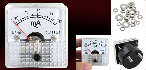 Product Name Analog Ammeter Model MP-45 Measuring Current Range AC 0-100mA Accuracy Class 2.5 Meter Face Size(Approx) 4.5 x 4.5 x 0.9cm / 1.8" x 1.8" x 0.35"(L*W*T) Thread Size 0.4 x 1.1cm / 0.157" x 0.433"(D*L) 0.28 x 1cm / 0.11" x 0.393"(D*L) Overall Depth 3.5cm / 1.37" Color White, Black Net Weight 51g Package Content 1 x Analog Ammeter Several Installing Parts - Reviews