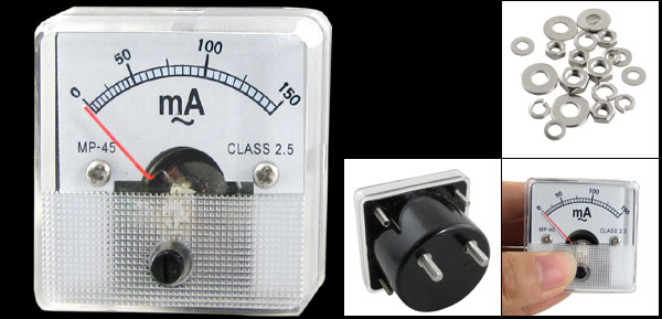 Product Name Analog Ammeter Model MP-45 Measuring Current Range AC 0-150mA Accuracy Class 2.5 Meter Face Size(Approx) 6.3 x 5.5 x 1cm / 2.5" x 2.2" x 0.39"(L*W*T) Thread Size 0.4 x 1.1cm / 0.157" x 0.433"(D*L) 0.28 x 1cm / 0.11" x 0.393"(D*L) Overall Depth 3.5cm / 1.37" Color White, Black Net Weight 51g Package Content 1 x Analog Ammeter Several Installing Parts - Reviews