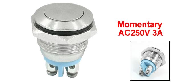 Item Name Push Button Switch Model MP16S/F10 Action Type Momentary Type Head Shape Flat Head Contact SPST(ON/OFF ) Switch Rating AC250V 3A Terminals Number 2 Panel Cutout Diameter 16mm/0.63" Total Size 22 x 19mm/0.87" x 0.75" (L*Max.W) Material Stainless Steel, Plastic, Electric Parts Housing Color Silver Tone Weight 15g Package Content 1 x Push Button Switch - Reviews