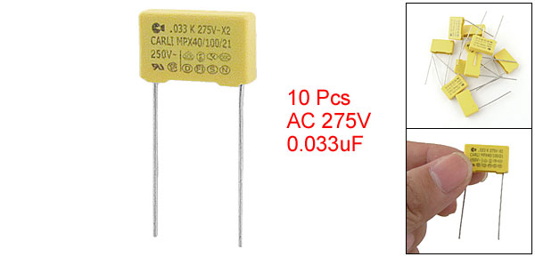 Product Name Safety Capacitor Dielectric Material Polypropylene Model MPX Series X2 Capacitance 0.033uF Tolerance ±10% Rated Voltage 250V AC Withstand Voltage 275V AC Body Size (Approx.) 17 x 11 x 5mm / 0.669" x 0.433" x 0.196" (L * W * T) Lead Size (Approx.) 0.8 x 27mm / 0.031" x 1.06" (D * L) Lead Spacing (Approx.) 13.5mm / 0.531" Color Yellow Weight 16g Package Content 10 x Safety Capacitor - Reviews