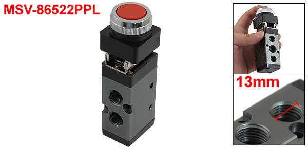 Product Name Mechanical Valve Model MSV-86522PPL Type Direct ActionActuator Type Momentary Red Flat Button Working Medium Air Position and Way No. 2 Position 5 Way Pipe Thread Diameter Air Inlet=Air Outlet=13mm