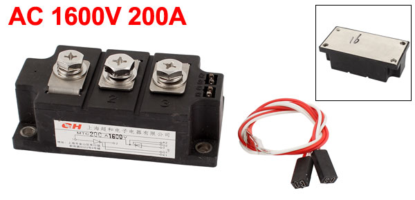 DetailsMTC-200A Silicon Controlled MTC Thyristor Module 200A 1600V  Product Name Thyristor Module Model MTC-200A Max. Average Forward Current 200A Max. Working Peak Reverse Voltage AC 1600V Terminals 3 Mount Hole Diameter 6.5mm/ 0.26" Mount Hole Distance 80mm/ 3.15"(Center to Center) Total Size 110 x 55 x 40mm/ 4.3" x 2.2" x 1.6" (L*W*H) Material Metal, Plastic Color Black, Silver Tone Net Weight 449g Package Content 1 x Rectifier Module