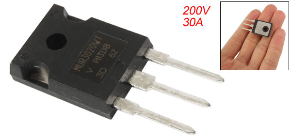 Product Name Ultrafast Rectifier Model No. MUR3020WT VRRM 200V IF(AV) 30A Mounting Hole Diameter 3.5mm/0.14'' Pin Size 15 x 5.5mm/0.6'' x 0.2'' ( L* Pitch) Total Size 34 x 15 x 5mm/1.3 x 0.6'' x 0.2'' (L*W*H) Weight 6g Package Content 1 x Ultrafast Rectifier - Reviews