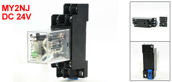 DetailsMY2NJ 24V DC Coil General Purpose Power Relay 8Pin 5A 240VAC/28VDC w Socket  Product Name Relay with Socket Relay Model No. MY2NJ Coil Voltage 24VDC Contact Capacity 5A, 240VAC/28VDC Number of Pins 8 Overall Size(Approx.) 70 x 22 x 65mm/2.8" x 0.9" x 2.56"(L*W*H) Material(External) Plastic Color Clear, Black Weight 62g Package Content 1 x Relay with Socket
