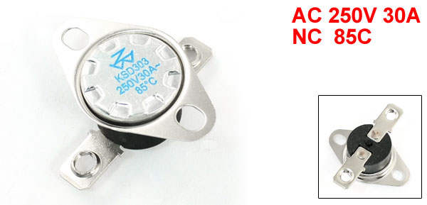 Product Name Temperature Control Switch Thermostat Model.No KSD303 Action Type NC Action Temperature 85C Voltage 30A AC 250V Size(Each) 3.5 x 3.3 x 1.3cm/1.4" x 1.3" x 0.51"(L*W*T) Material Metal, Plastic Color Black, Silver Tone Net Weight 6g Package Content 1 x Temperature Control Switch Thermostat - Reviews