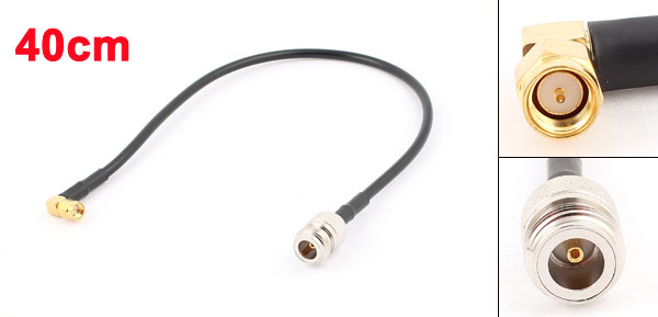 Product Name N Female to SMA Male Right Angle Adapter Connector Type N Female to SMA Male Right Angle Adapter Cable Type RG58 Resistance 50Ohm Length(Approx) 40cm / 16" Insertion Loss 1.0dB(Max.) VSWR 0-3GHz(1.5 Max.) Material Plastic, Metal Color Black, Gold Tone, Silver Tone Net Weight 47g Package Content 1x N Female to SMA Male Right Angle Adapter - Reviews