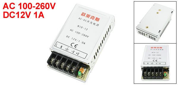 Product Name Switching Power Supply Model N10-12 Input AC 100-260V, DC12V 1A Working Temperature 10°C- 50°C Size 8 x 5 x 2cm/ 3.15" x 2" x 0.8" (L*W*H) Material Electronic Parts Color Silver Tone Weight 68g Package 1 x Switching Power Supply - Reviews