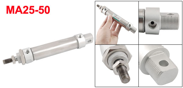 Product Name Air Cylinder Model MA25-50 Action Type Double Acting Working Fluid Air Bore 25mm/1'' Stroke 50mm/2'' Max.Press 1.0 Mpa Rod Thread Diameter 9.8mm/0.39'' Piston Rod Diameter 10.2mm/0.4'' Screw Hole Diameter 8.5mm/0.33'' Threaded End Diameter 21.6mm/0.85'' Overall Size 190 x 34mm/7.5'' x 1.3'' (L*Max. W) Material Stainless Steel Color Silver Tone Weight 270g Package Content 1 x Air Cylinder - Reviews