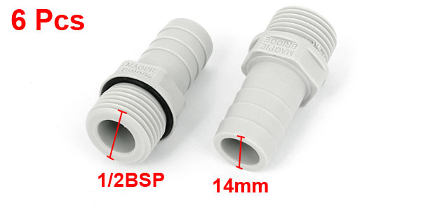 Product Name Hose Barb Coupler Type Male Thread to Hose Barb Fit Hose Inner Diameter 14mm / 0.55" Male Thread Diameter 20mm/1/2BSP Overall Size 47 x 24mm / 1.85" x 0.94" (L*Max.D) Material Plastic Color Gray Net Weight 65g Package Content 6 x Hose Barb Couplers - Reviews