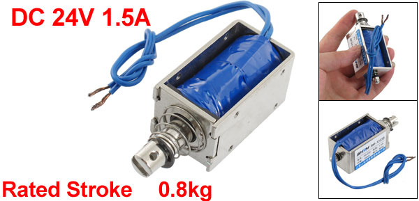 Product Name DC Solenoid Electromagnet Type MR-1253B Rated Voltage DC 24V Rated Current 1.5A Action Form Push Rated Stroke 10mm, 0.8kg Body Size(Approx) 5.2 x 4 x 3.7cm / 1.2 "x 0.7" x 0.6" (L*W*H) Cylinder Size(Approx) 8.5 x 1cm / 3.3" x 0.4" (L*D) Cable Length(Approx) 23cm / 9.0" (Each) External Material Metal, Electronic Parts Main Color Silver Tone Weight 203g Package Content 1 x DC Solenoid Electromagnet - Reviews