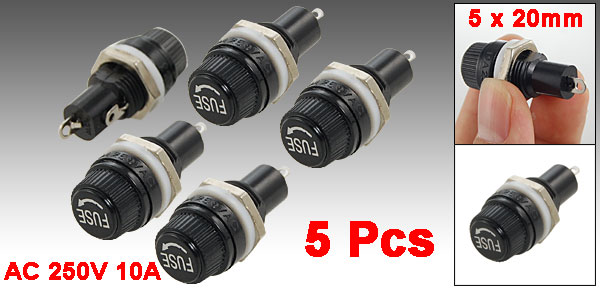Product Name PCB Fuse Holder Model FH043 Fit Fuse Size 5 x 20mm Rated Power AC 250V, 10A Thread Size 12.5mm/ 0.5" Length 37mm/ 1.46" Material Plastic & Metal Color Black Net Weight 34g Package Content 5 x PCB Fuse Holder - Reviews