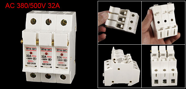 Product Name Fuse Holder Type RT18-32A Fit Fuse Type 10 x 38mm / 0.394" x 1.496"(D*H)(Not Included Here) Rated Insulation Voltage 500V Rated Voltage AC 380V Rated Current 32A Poles Quantity 3P Material Hard Plastic & Metal Color See the Picture Overall Size(Approx) 7.9 x 5.2 x 6.2cm / 3.1" x 2" x 2.4"(L*W*H)