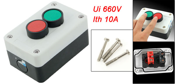 Product Name Push Button Switch Station Material Plastic, Metal Ui 660V Ith 10A Round Push Button Switch Action Type Momentory Contact Type Green Push Button Switch: 1NO Red Switch: 1NO Overall Size(not include button) 10.3 x 6.7 x 5cm/ 4.1" x 2.6" x 2" (L*W*H) Button Diameter 2.8cm/ 1.1" Mounting Hole Diameter 5mm/ 0.2" Color Green, Red, White, Black Button Color Green, Red Weight 162g Package Content 1 x Push Button Station - Reviews