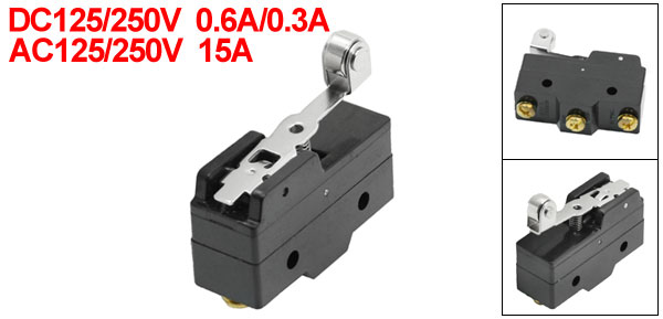 DetailsNO NC Microswitch Parallel Roller Lever Basic Limit Switch XZ-15GW3-B  Product Name Limit Switch Model XZ-15GW3-B Rating & Voltage AC125/250V, 15A DC125/250V, 0.6A/0.3A Contact Configuration 1NO, 1NC(SPDT) Actuator Action Momentary Actuator Type One-way Roller Lever Termination Type Screw Terminal Two Fixing Hole Center Distance 2.5cm /1" Fixing Hole Diameter 0.4cm / 0.16" Lever Total Length 4.9cm / 1.9" Roller Diameter 0.9cm/ 0.35" Switch Size 5 x 1.8 x 4.7 cm / 2" x 0.7" x 1.9" (L*W*H) Material(External) Plastic, Metal Color Black, Silver Tone, Gold Tone Weight 36g Package Content 1 x Limit Switch