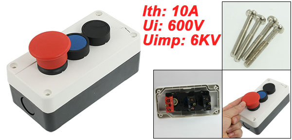 Product Name Push Button Station Material Plastic, Metal Mushroom and Black Head Ui: 400V Ith: 10A Blue Head Ith: 10A Ui: 600V Uimp: 6KV Action Type Momentary Contact Type Blue and Black Head: NO Mushroom: NC Button Diameter Blue and Black Head: 2.9cm / 1.14" Mushroom: 4cm / 1.6" Box Size (Approx.) 13.2 x 6.7 x 5cm / 5.2" x 2.6" x 2" (L * W * T) Color Red, White, Black, Blue Weight 230g Package Content 1 x Push Button Station - Reviews