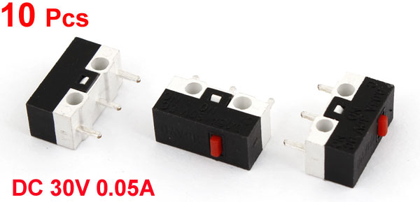 Product Name Micro Switch Voltage & Current DC 30V 0.05A Poles SPDT Contact Type 1NO + 1NC Actuator Type Push Button Terminal Type 3 Pin Terminals Overall Size(Pin not included) 13 x 6 x 6.3mm / 0.5" x 0.24" x 0.25" (L*W*H) Mounting Hole Dia. 2mm / 0.08" Mounting Hole Spacing 6mm/ 0.2" Pin Size 3 x 0.8mm/ 0.12" x 0.03"(L*W) Push Button Size 3 x 1mm / 0.12" x 0.04" (L*W ) Material Plastic, Metal Color Black, White Total Weight 6g Package Content 10 x Micro Switches - Reviews