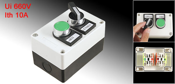 Product Name Push Button Station Ui 660V Ith 10A Material Plastic, Metal Button Diameter(Approx.) 2.5cm/ 1" Handle Length 3.5cm/ 1.4" Overall Size(not include the button) 10.8 x 7.1 x 6.3cm/ 4.3" x 2.8" x 2.5" (L*W*H)