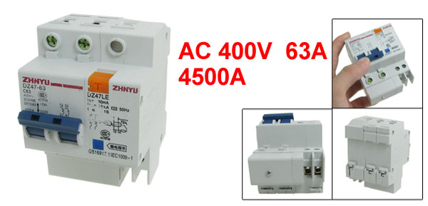 Product Name Earth Leakage Circuit Breaker Material Plastic, Electric Components Model DZ47LE-63 Type C63 Rated Voltage AC 400V Rated Circuit Breaking Capacity 4500A Frequency 50Hz Rated Current 63A Total Size (Approx.) 6.5 x 6.3 x 9.3cm/ 2.5" x 2.4" x 3.6" (L*W*H) Number of Poles 2 Color White Weight 277g Package Content 1 x Earth Leakage Circuit Breaker - Reviews