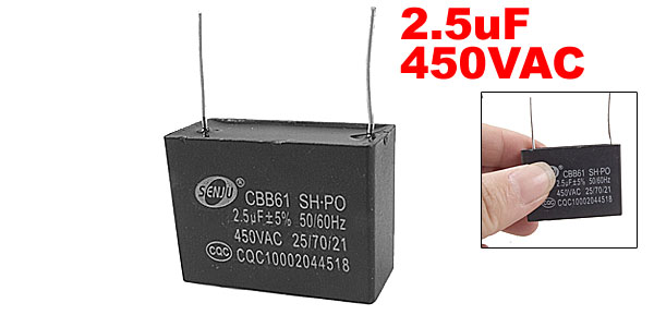 Product Name Motor Capacitor Housing Material Plastic Dielectric Material Metallized Polypropylene Film Model CBB61 Capacitance 2.5uF Tolerance 5% Rated Voltage 450VAC Frequency 50/60Hz Body Size 2.8 x 3.8 x 1.6cm/1.1" x 1.5" x 0.6"(H * W * T) Lead Diameter 0.9mm/0.035" Color As Picture Shown Weight 22g Package Content 1 x Motor Capacitor - Reviews