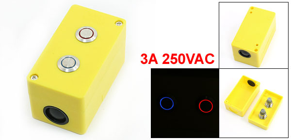 Product Name Push Button Station Action Type Latching Action Contact Type SPDT Working Voltage & Current 3A 250VAC Max. Withstand Current 16A Light Voltage 12V Light Color Red, Blue Button Dia 1.8cm/0.7" Overall Size 9 x 5 x 5cm/3.5" x 2" x 2"(L*W*H) Wire Hole Dia 20mm/0.78" Mounting Hole Dia 4mm/0.16" Mount Hole Distance 60mm x 35mm/2.4" x 1.4"(L*W) Material Plastic, Metal Color Yellow, Silver Tone, Red, Blue Net Weight 83g Package Content 1 x Push Button Station - Reviews