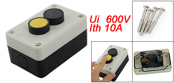 Product Name Push Button Station Material Plastic, Metal Ui 600V Ith 10A Working Voltage AC 240V Working Current 3A Uimp 6KV Action Type Momentary Contact Type 2 NO Button Size (Approx.) 3 x 1cm / 1.18" x 0.39" (D * H ) Box Size (Approx.) 10.3 x 6.6 x 5cm / 4" x 2.59" x 1.96" (L * W * T) Mounting Screw Hole Diameter (Approx.) 8.5mm / 0.33" Color Yellow, Black, White Weight 164g Package Content 1 x Push Button Station - Reviews