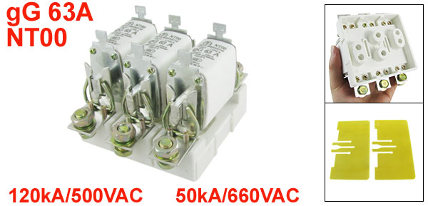 Product Name Fuse Link w Base Model NT00, gG 63A Pole Quantity 3 Poles Rated Breaking Capacity 120kA/500VAC 50kA/660VAC Rated Current 63A Overall Size 117 x 97 x 80mm / 4.6" x 3.8" x 3.1"(L*W*H) Fixing Hole Diameter 7mm / 0.27" External Material Ceramic, Resin & Metal Color As Picture Shown Weight 821g Package Content 1 x Fuse Link w Base 2 x Partitions - Reviews