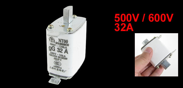 Product Name Blade Contact Fuse Link Model NT00, gG 32A Rated Breaking Capacity 500V, 120kA 600V, 50kA Rated Current 32A Main Body Size 44.5 x 29 x 49mm / 1.75" x 1.1" x 1.93"(L*W*H) Overall Size 56.5 x 29 x 76cm / 2.2" x 1.1" x 3"(L*W*H) External Material Ceramic & Metal Color White & Silver Tone Weight 147g Package Content 1 x Blade Contact Fuse Link - Reviews