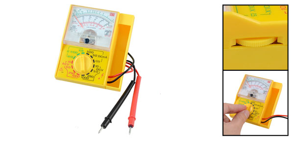 Product Name Analog Multimeter Model NY-128 DC Voltage 0-10-50-250-1000V AC Voltage 0-10-50-250-1000V DC Current 0-0.5-50-250mA Resistance(ohm) 1k-10K-100K Voice Frequency -20 to 56db Main Color Yellow External Mateiral Plastic Size 9 x 7.5 x 3cm/ 3.5" x 2.95" x 1.2" (L*W*T) Cable Length 35cm/ 13.8" Net Weight 77g Package Content 1 x Analog Multimeter