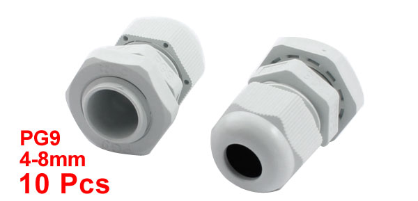 Product Name Cable Gland Model PG9 Cable Range 4-8mm / 0.16"-0.3" Thread O.D. 14mm Total Size 33 x 22mm / 1.3" x 0.87" (L*D) Main Material Nylon, Rubber Color White Weight 65g Package Content 10 x Cable Gland - Reviews