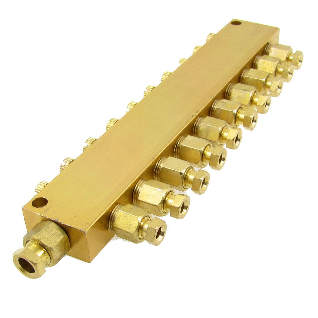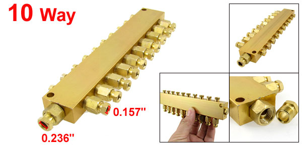Product Name Oil Distributor Type 10 Way Material Brass Color Gold Tone Main Adapter Hole DIa. 6mm/0.236" Branch Adapter Inside DIa. 4mm/0.157" Hole Diameter 5mm/0.2" Hole Distance 157mm/6.18" (Center to Center) Dimension 18.2 x 5 x 1.3cm/7.1" x 2" x 0.5"(L*W*H) Net Weight 257g Package Content 1 x 10 Way Oil Distributor - Reviews