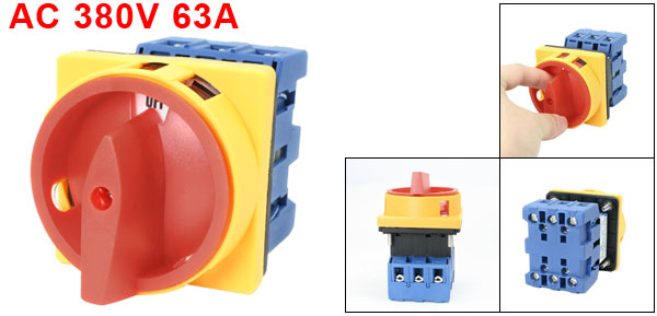 Product Name Changeover Cam Switch Model GLD11-63A Control Type On - Off Positions Quantity 2 Terminals Quantity 6 AC-23A AC 380V, 63A DC-23A DC 220V 63A Icw 1000A Icm 1410A Overall Size 65 x 65 x 95mm/ 2.5" x 2.5" x 3.7"(L*W*H) Mateiral Plastic, Electronics Color Black, Blue, Red, Yellow Net Weight 257g Package 1 x Changeover Cam Switch