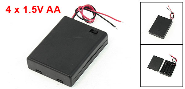 DetailsOn/Off 2 Wires Lead Switch 4 x1.5V AA Battery Cell Case Box  Product Name 1.5 V AABattery Case Battery Type 4 x 1.5 V AA Material Plastic, Electric Part Dimension 6.3 x 4.5 x 1.5cm/ 2.5" x 1.8" x 0.6"(L*W*H) Cable Length 15cm/ 5.9" Color Black Weight 24g Package Content 1 x 1.5V AABattery Case