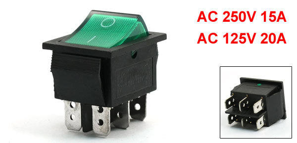 Product Name Rocker Switch Poles DPDT Terminals 6 Pins Position Latching, ON/OFF Two Position Rated Voltage AC 250V 15A