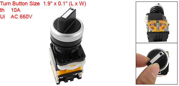 Item Name Rotary Switch Type 2 Position Self-locking Ith 10A Ui AC 660V IEC 947 Selector Button Diameter 29mm / 1.1" Mount Hole Diameter 22mm / 0.86"(7/8") Fit Panel Thickness Max 8mm / 0.3" Overall Size 42 x 28.5 x 79mm / 1.65" x 1.1" x 3.1" (L*W*H) Button Color Black, White and Silver Tone Material Plastic and Metal Weight 53g Package Content 1 x Rotary Switch - Reviews
