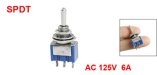 DetailsOn/Off/On SPDT 3 Ternimals AC 125V 6A Miniature Toggle Switch  Product Name Toggle Switch Rating AC 125V 6A Pin Number 3 Pins Position 3(On/Off/On) Type SPDT(Latching) Screw Diameter 5.7mm / 0.224" Total Size(Approx.) 3.2 x 1.3 x 0.8cm / 1.3" x 0.5" x 0.3"(L*W*T) Weight 6g Package Content 1 x Toggle Switch