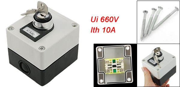 Product Name Keylock Rotary Selector Switch Station Material Plastic, Metal Ui 660V Ith 10A Selector Switch Mode 3 Position on/off/on Overall Size(not include button) 7.5 x 7 x 6.3cm/ 3" x 2.8" x 2.5" (L*W*H) Switch Knob Dimeter 2.5cm/1" Mounting Hole Diameter 5mm/ 0.2" Color White, Black Weight 182g Package Content 1 x Keylock Rotary Selector Switch Station 2 x Keys - Reviews