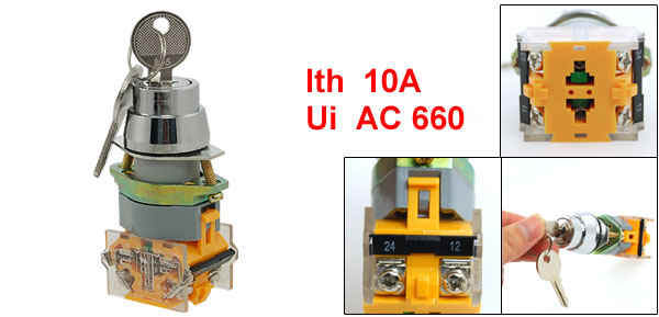 Product Name Rotary Switch Model No. LA39-20Y Ith 10A Ui AC 660V Positions Quantity 3 Position Terminals Quantity 4 Panel Cutout Diameter 2.2cm / 0.87"(7/8") Fit Panel Thickness(Adjustable) Max 0.8cm / 0.3" Overall Overall 3.6 x 2.9 x 7.4cm / 1.4'' x 1.1'' x 2.9'' (L*W*H) Main Material Plastic, Metal Main Color Orange, Silver Tone, Gray Net Weight 102g Package Content 1 x Rotary Switch 2 x Metal Keys - Reviews