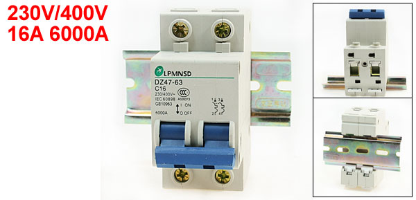 ON-OFF Switch 2 Pole Short Circuit Breaker 230V/400V 16A 6000A + Lead Rail