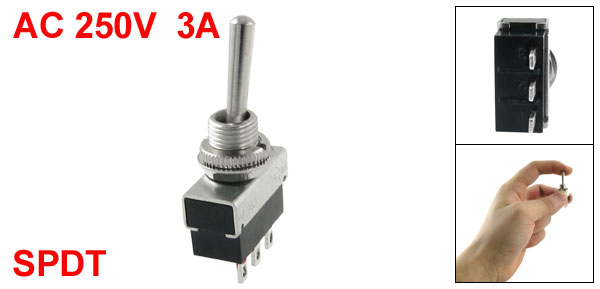 DetailsON-ON 2 Position SPDT 3 Pins Terminals Toggle Switch AC 250V 3A  Product Name Toggle Switch Type SPDT Position 2 Positions(On/On) Mounting Hole Diameter 8mm / 0.3" Rated Voltage & Current AC 250V, 3A Terminals 3 Main Body Size 20 x 9.4 x 12mm / 0.8" x 0.37" x 0.5"(L*W*H) Overall Height 41mm / 1.6" Material Metal & Resin Weight 11g Package Content 1 x Toggle Switch