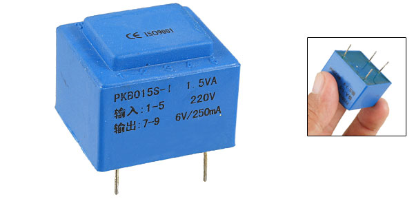Product Name Encapsulated Transformer Model No. PKB015S-I Primary Work Voltage 220V Work Frequency 50-60Hz Insulation Grade Grade B Power 1.5VA Primary Pin 1-5 Secondary Pin 7-9 Secondary Full-load Voltage 6V Secondary No-load Voltage 7.9V Secondary Output Current 250mA Mounting Height 28mm/ 1.1" Number of Pins 4 Pin Length 9mm/ 0.93" Pin Diameter 0.8mm/ 0.031" Overall Size(Approx.) 30 x 27 x 32mm/ 1.2" x 1.1" x 1.3" (L*W*H) Material Epoxy Resin Color Blue Weight 70g Package Content 1 x Encapsulated Transformer - Reviews