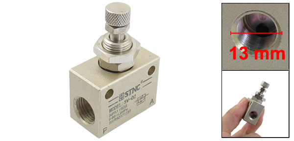 Product Name Gas Valve Model SV-02 Working Medium Air Flow Direction One Way Female Thread Diameter 13mm Female Thread Size 1/4"PT Fixing Hole Diameter 4.5mm/ 0.18" Fixing Hole Distance 25mm/ 0.98"(Center to Center) Mount Thread Diameter 12mm/ 0.47" Suitable Board(Max) 4mm/ 0.157"(Adjustable) Working Pressure Range 0.05~1.2Mpa Operating Temperature Range -5~99C Body Size 3.5 x 1.9 x 2.6cm/ 1.38"x 0.75"x 1.02"(L*W*H) Total Size(Approx) 3.5 x 1.9 x 5.3cm/ 1.97"x 0.98"x 2.09"(L*W*H) External Material Metal Color As Picture Shown Net Weight 63g Package Content 1 x Gas Valve - Reviews