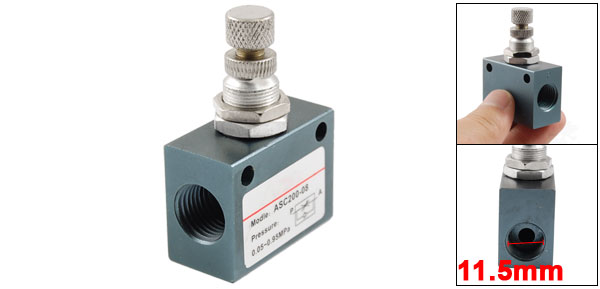 Product Name Flow Control Valve Model ASC200-08 Flow Direction One Way Working Medium Air Thread P1/4" PT (11.5mm) Working pressure 0.05-0.95Mpa Working temperature -5-60 Celsius Degree Knob Thread Diameter 11.8mm/0.46'' Total Size 5 x 3.6 x 1.8cm/2'' x1.4'' x 0.7'' (L*W*H) Material Aluminum Alloy Net Weight 49g Package Content 1 x Flow Control Valve - Reviews