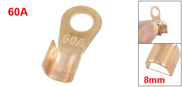 Product Name Copper Passing Through Terminal Current 60A Ring Size 8 x 14mm / 0.31" x 0.55"(Inner Dia.*OD) Cable Connector Size 8 x 10mm / 0.31" x 0.39"(Inner Width*Length) Overall Length 31mm / 1.2'' Material Copper Weight 5g Package Content 1 x Copper Passing Through Terminal - Reviews