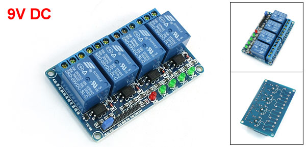 Product Name Relay Module Model SRD-09VDC-SL-C Number of Channels 4 Coil Voltage 9V DC Contact Capacity 10A, AC 250V/125V, DC 30V/28V Size 7.3 x 4.5 x 2cm/2.9" x 1.8" x 0.78"(L*W*H) Material PCB Color Blue Weight 64g Package 1 x Relay Module - Reviews