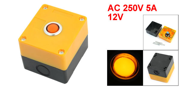 Product Name Push Button Station Action Type Latching Hole Diameter 22mm/ 0.87" Ith 5A/AC 220V Push Button Rating AC 250V 5A Lamp Voltage 12V Lamp Color Orange Contact Type SPDT( 1 NO 1 NC) Box Size 78 x 71 x 65mm/3" x 2.8" x 2.5" (L*W*H) Button Dia 16mm/0.6" Mounting Hole Diameter 5mm/ 0.2" Mounting Hole Center Distance 64 x 58mm/2.5" x 1.5"(L*W) External Material Plastic External Color Black, Yellow, Orange Net Weight 123g Package Content 1 x Push Button Station