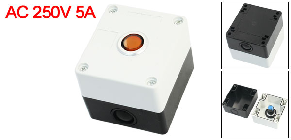 Product Name Push Button Station Hole Diameter 22mm/ 0.87" Push Button Rating AC 250V 5A Contact Type SPDT( 1 NO 1 NC) Box Size 78 x 71 x 65mm/3" x 2.8" x 2.5" (L*W*H) Button Dia 16mm/0.6" Mounting Hole Diameter 5mm/ 0.2" Mounting Hole Center Distance 64 x 58mm/2.5" x 1.5"(L*W) External Material Plastic External Color Black, White, Orange Net Weight 125g Package Content 1 x Push Button Station