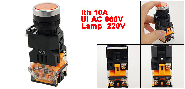 Product Name Push Button Switch Model No. LA160-22A3-11DNZS Contact Type 1 NO(Normally Open) + 1 NC(Normally Close) Action Type Self Locking Ith 10A Ui AC 660V LED Light Voltage 220V Button Diameter 24mm / 0.94" Mount Hole Diameter 22mm / 0.87"(7/8") Fit Panel Thickness(Adjustable) Max 5mm / 0.2" Total Size 36 x 29 x 86mm / 1.4'' x 1.1'' x 3.4'' (L*W*H) Main Material Plastic, Metal Main Color Push Button: Orange Body: Black, Orange, White Weight 67g Package Content 1 x Push Button Switch - Reviews