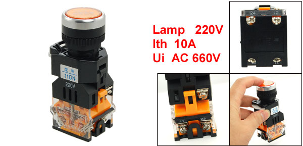 Orange Sign Momentary Push Button Switch w 220V Lamp Light 1 NO 1 NC 10A 660V AC
